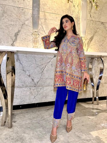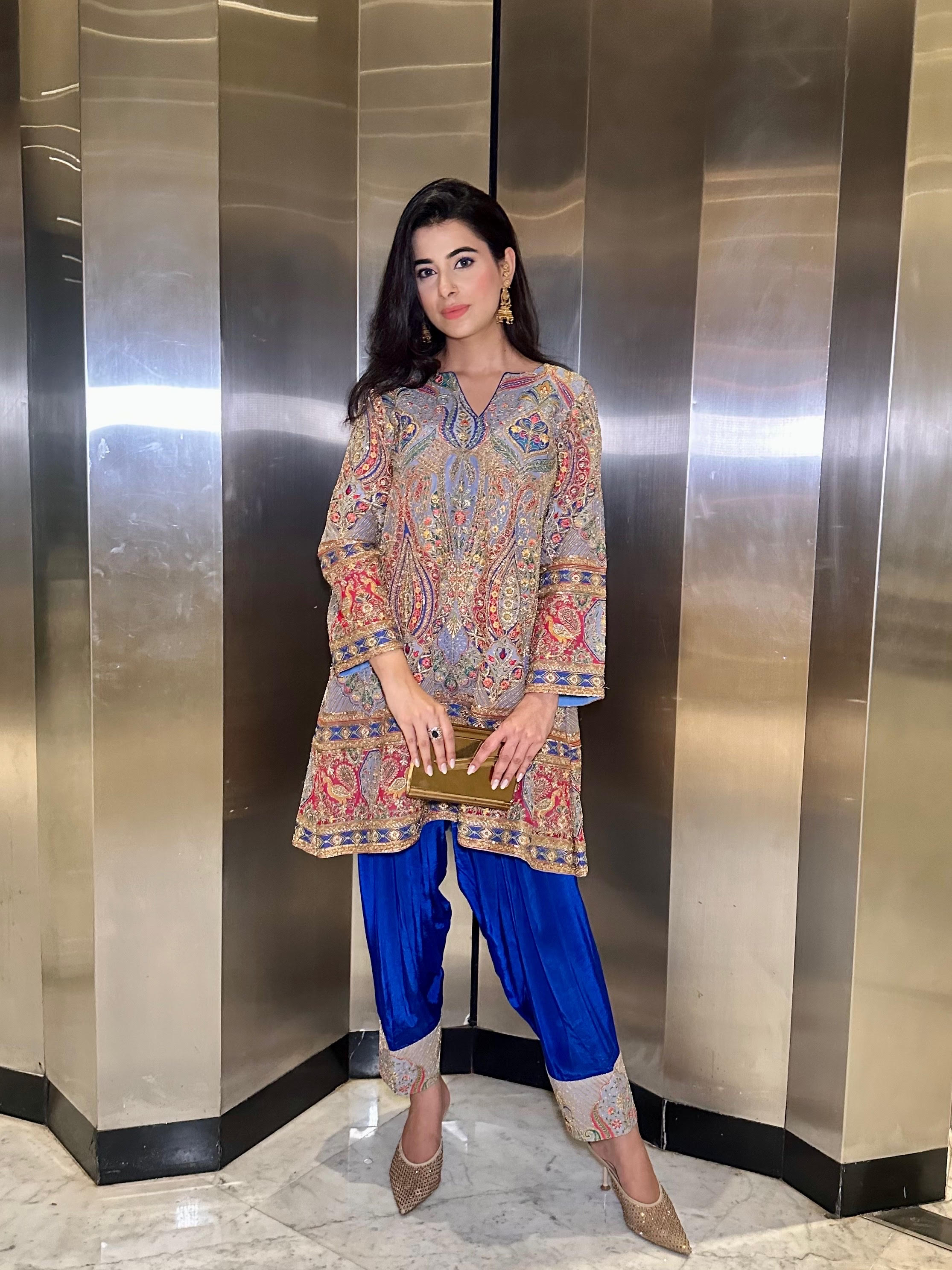 A festive classic, embroidered in opulent zardozi and resham, highlighted with sequins and fine tilla. Paired with a fluid viscose crepe salwar detailed with embroidered hems. This ensemble is a portrait of artisanal finesse and timeless luxury.