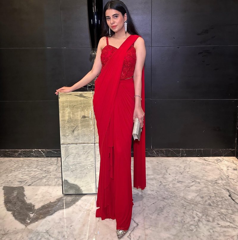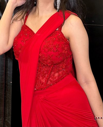 A drape that celebrates modern festivity, paired with a hand-embroidered corset blouse.