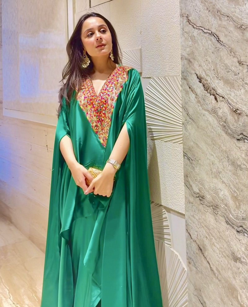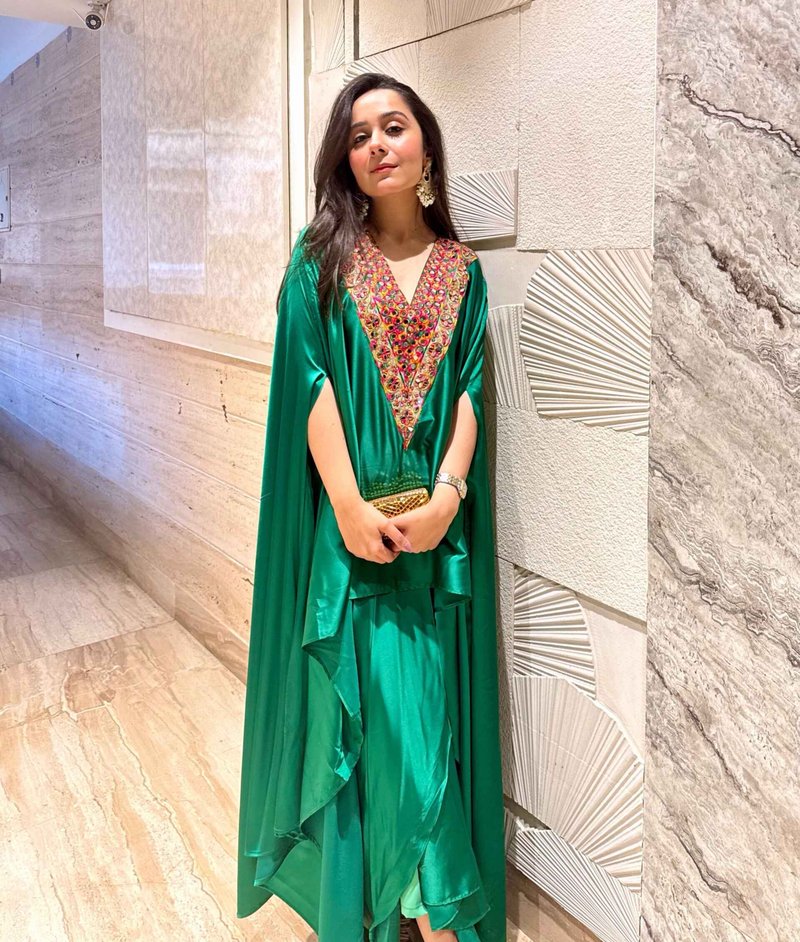 Lustrous satin paired with a jewel-toned, mirror-work embellished neckline that steals the spotlight.