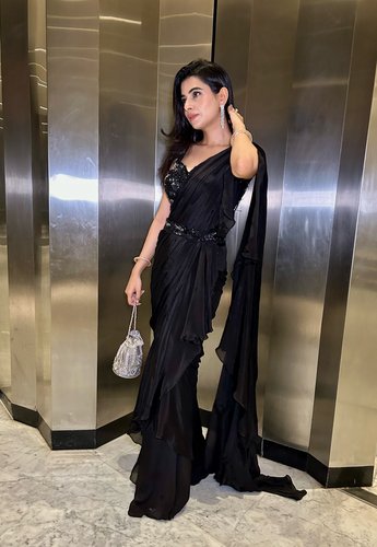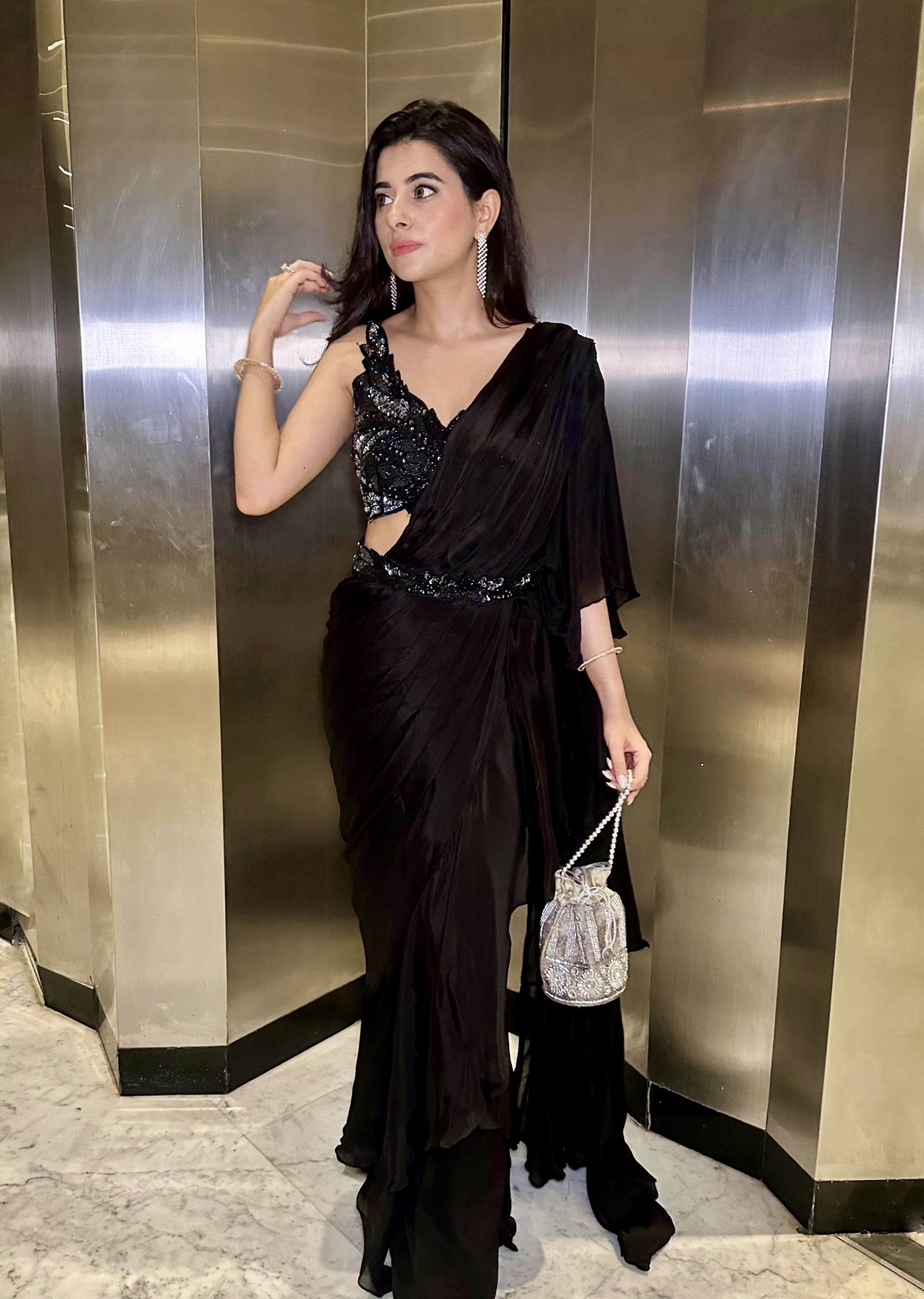 Introducing Ezara — a contemporary drape saree with cascading frills and hand-embroidered sequin-bead detailing.